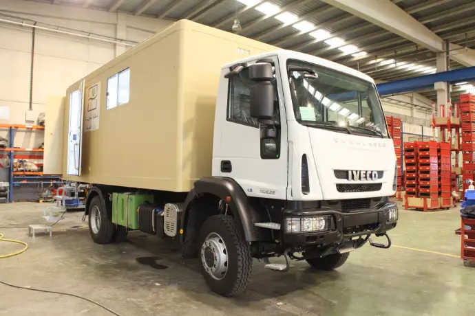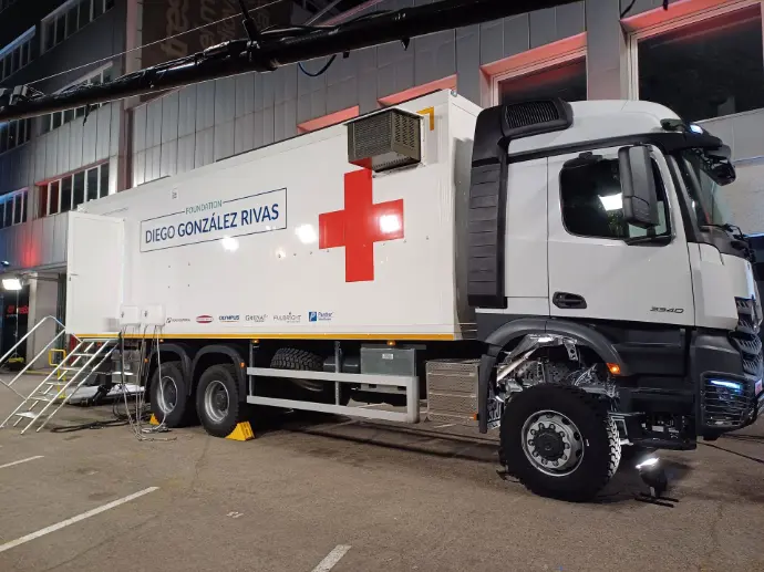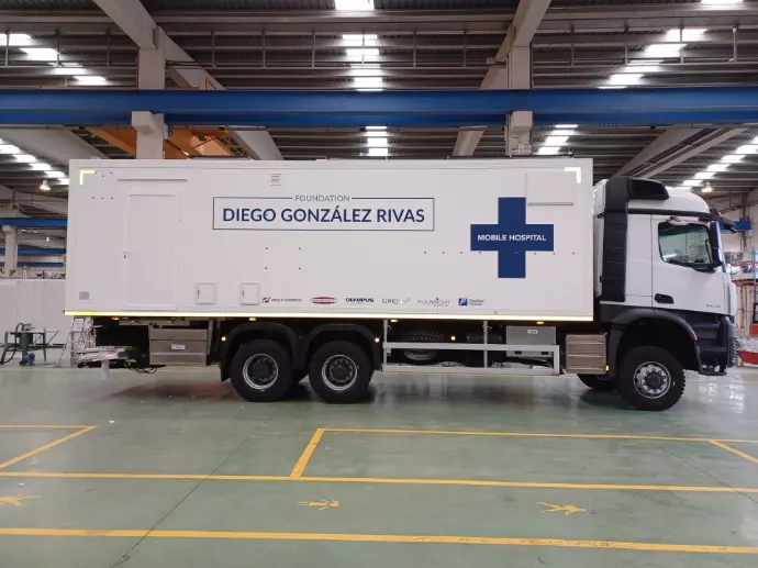 Vehículo todo terreno 4x4, especializada en cirugía laparoscópica. Cuenta con Área de Oficina/Sala de Diagnóstico, Aseo, Sala de Recuperación, Área de Esterilización /Asepsia y Sala Quirúrgica. Dispone de plataforma PMR exterior para el acceso de pacientes a la unidad.