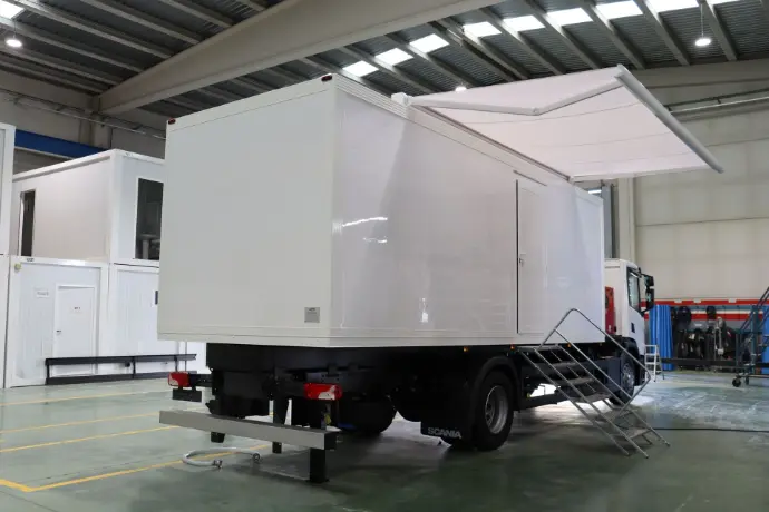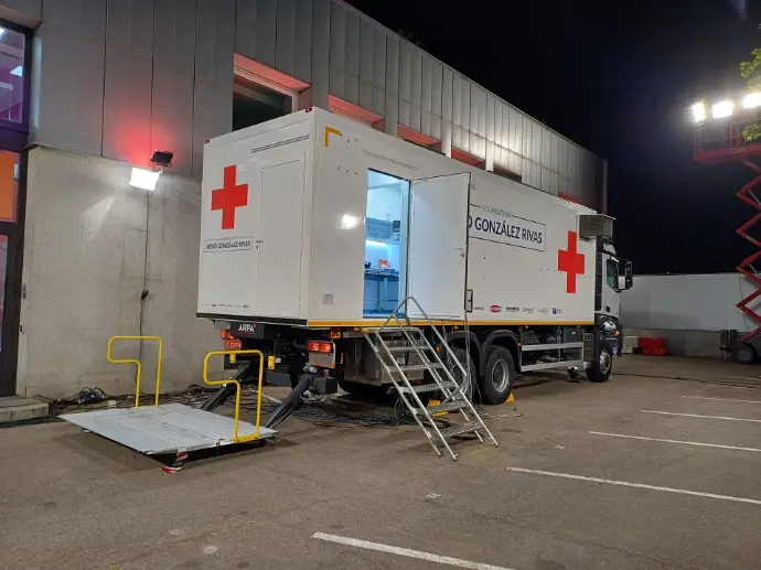 Vehículo 4x4. Cuenta con Área de Recepción/Sala de Espera, Aseo y Sala de Consulta Médica. Dispone de plataforma PMR exterior para el acceso de pacientes a la unidad.