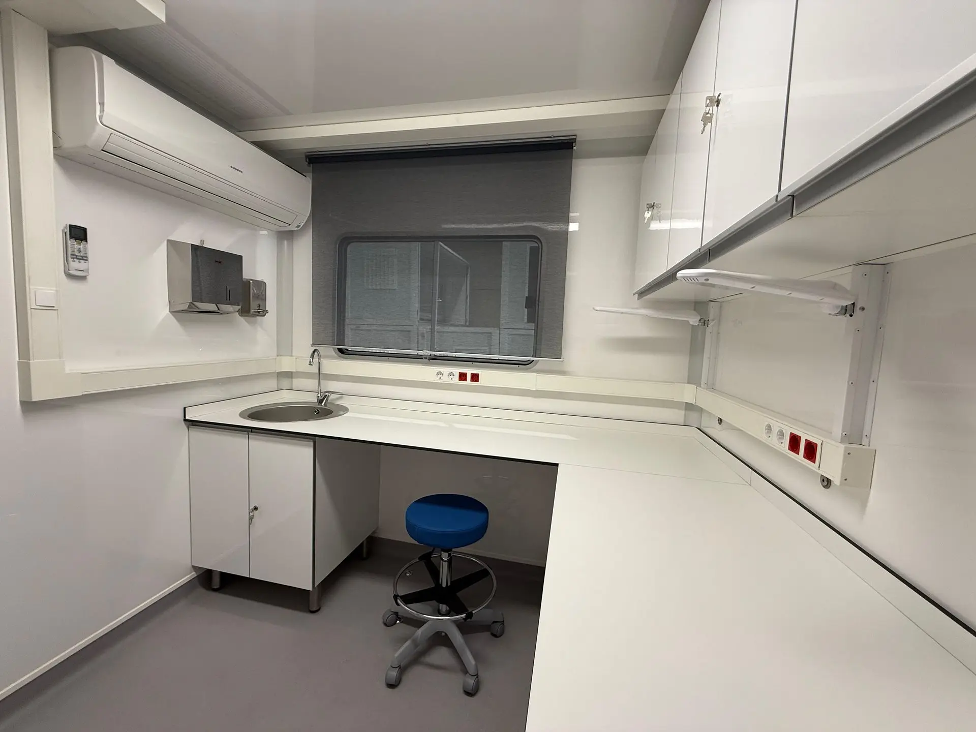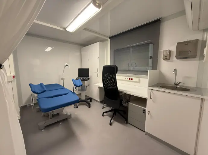 Vehículo 4x2 especializado en consulta ginecológica. Equipado con Sala de Exploración, Área de Laboratorio y Aseo. Dispone de camilla, ecógrafo, lámpara de observación, escritorio, lavabo, armarios, frigorífico y esterilizador. Unidad completamente acondicionada con instalación eléctrica, agua y climatización.