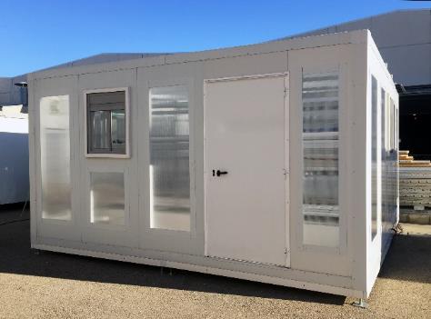 Descripción: Construcción modular con la instalación de distintos sistemas hidropónicos para cultivo interior, con control de temperatura y humedad mediante un sistema de aire acondicionado y ventilación para mantener condiciones climáticas óptimas. Además, cuenta con ventanas de policarbonato en paredes y techos que permiten el acceso de luz natural para las plantas.