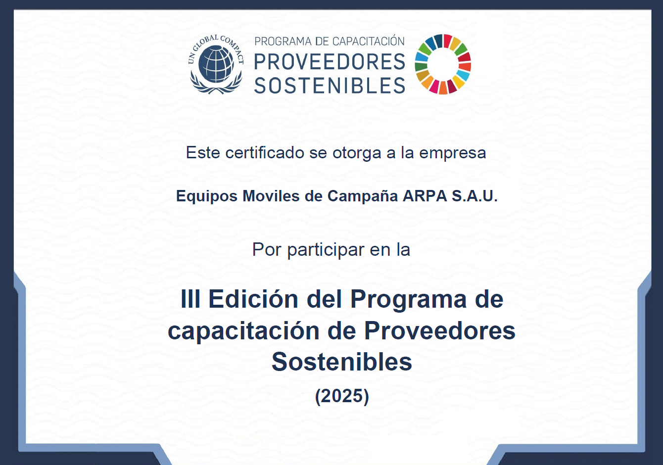 En ARPA seguimos avanzando con paso firme en nuestro compromiso con la sostenibilidad. Nos complace anunciar que hemos obtenido el Certificado de Capacitación de Proveedores Sostenibles, una iniciativa promovida por el Pacto Mundial de las Naciones Unidas.