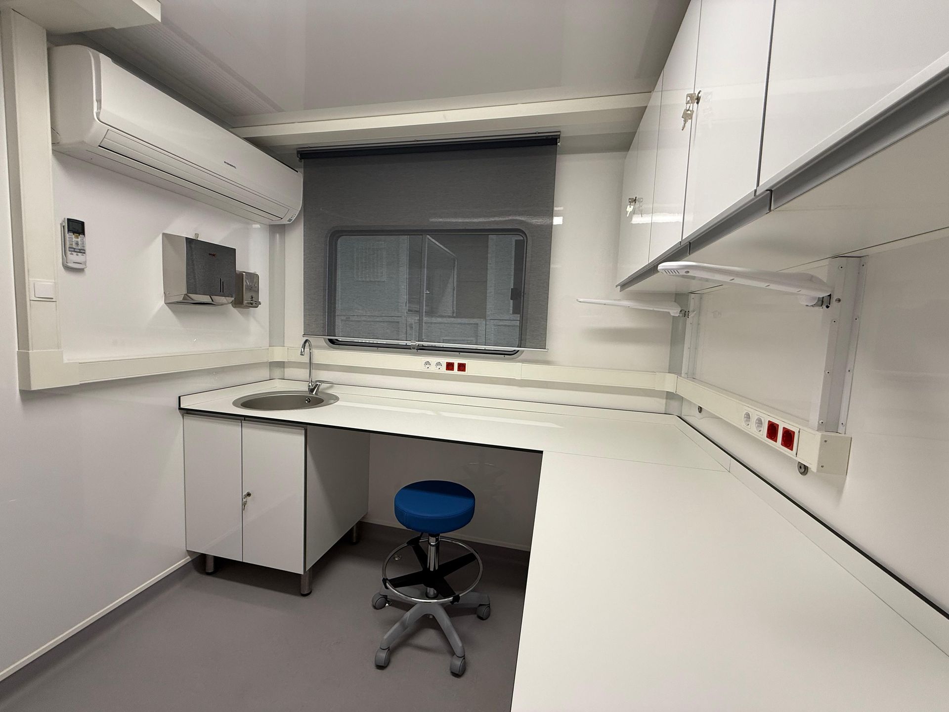 - Área de laboratorio con encimera de trabajo, armarios superiores e inferiores, lavabo independiente, frigorífico y esterilizador para material médico.