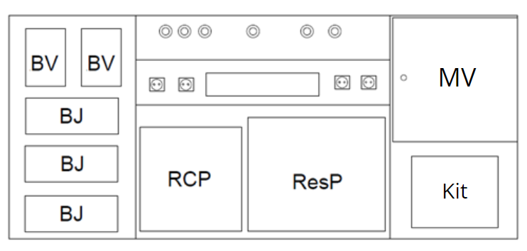 BJ: Bomba Jeringuilla / BV: Bomba Volumétrica / KIT: de traqueo, viales AMBU RCP: Resucitador Cardio Pulmonar / ResP: Respirador / MV: Monitor Vitales